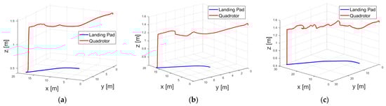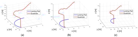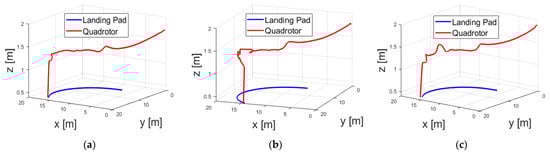 Trajectory of quadrotor and landing pad in case 1. (a) Trajectory with Gaussian noise with a standard deviation σ = 0.01. (b) Trajectory with Gaussian noise with a standard deviation σ = 0.5. (c) Trajectory with Gaussian noise with a standard deviation of σ = 1.0.