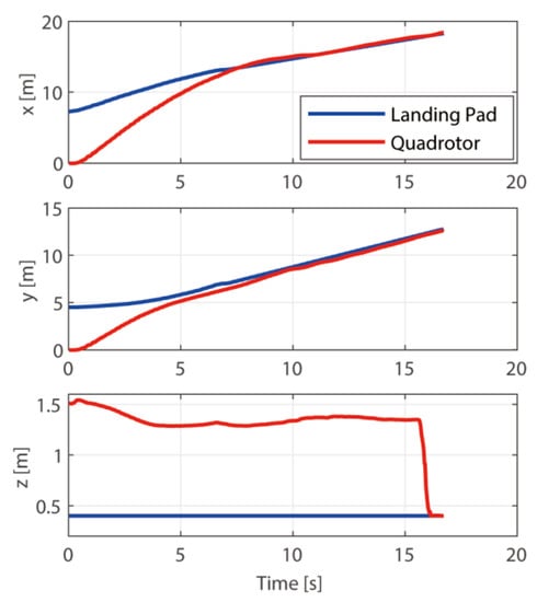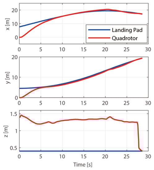 We first used the method proposed in [13] to plan the landing trajectory, and the results are shown in Figure 4. The UGV moves along the x direction at a speed of 0.8 m/s. The quadrotor follows the UGV about 0.5 m behind, making it impossible for the drone to land on it, meaning that the landing mission has failed.