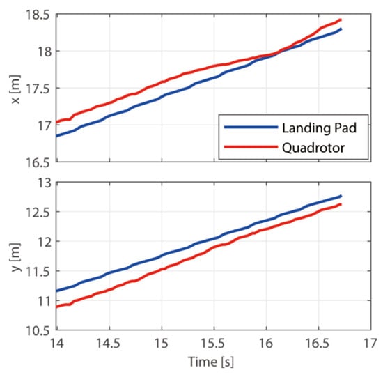 In case 2, the UGV performs circular motion with a linear velocity of 0.8 m/s and an angular velocity of 0.15 rad/s between buildings. As shown in Figure 10, the quadrotor is able to land on the UGV as the Gaussian noise increases. It can be seen that the drone can follow the UGV while avoiding obstacles. As shown in Figure 11, the quadrotor approaches the UGV in the x and y directions after 15 s and lands on it in 28 s. Figure 12 shows the position error near the landing point.