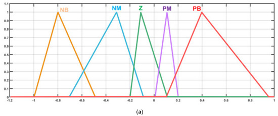 During the fuzzification process, the membership grade was determined. Both the inlet and outlet triangles formed control parameters, as depicted in Figure 6 and Figure 7, and were obtained after a sequence of trial and error. It is worth mentioning that, when additional fuzzy measures were set, such as nonlinear regression features, and were examined and tried, the system functioned admirably. Unfortunately, in several cases, the input and output membership algorithms produced great outcomes. This is why triangle membership functions were used for this study. Figure 6 depicts the symbols NB (negative large), NM (negative medium), Z (zero), PM (positive medium), PB (positive big), N (negative), and P (positive). In Figure 7, the membership functions of the thyristors’ firing angle (alpha), are NB, NM, Z, PM, and PB. Throughout this work, one continuity formula [41] was used to determine the degree of crisp values: