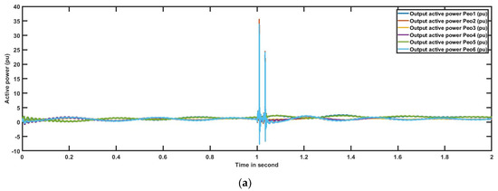 Figure 16 and Figure 17 represent voltage changes at the PCC as a result of both 3LG temporary and permanent failures at location A with a 900 ms delay. The responses show that delayed minimization techniques worked well and enhanced the power performance of the system. In terms of improving hybrid grid power quality, the results also suggest that the fuzzy-logic-controlled strategy beat the modified predictor method. The proposed approach’s efficacy in limiting the negative impacts of delay and enhancing the system power quality was proved. Therefore, the fuzzy-logic-controlled technique beat the improved logic-controlled predictor method. Figure 18 shows the fluctuation in the active power of the generator in the test system (G1–G6). When the three-phase failure occurred, at the two generators immediately dropped out of the synchronization process.