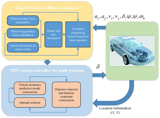The purpose of this paper is to enable intelligent vehicles to quickly and accurately estimate the friction coefficient, and to perform effective trajectory tracking control based on the identification results. Therefore, this paper constructs two main functional modules; the first module is a friction coefficient estimator based on VFF-RLS, and the second module is a trajectory tracking control system based on MPC. The specific structural block diagram is shown in Figure 1.
