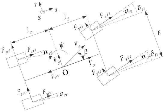 In Figure 2 and Equation (1), m is total vehicle mass, and are the distance from the center of mass to the front and rear axles, E is wheel track (average of front and rear track), and are the front left wheel angle and front right wheel angle, supposing , is centroid slip angle, is the centroid velocity, is yaw rate, is the moment of inertia of the vehicle about the z-axis, and are vehicle longitudinal and lateral speed, and are wheel longitudinal and lateral forces (I = fl, fr, rl, rr), is tire slip angle (I = fl, fr, rl, rr), is vehicle normal force (I = fl, fr, rl, rr), is rolling resistance, (I = fl, fr, rl, rr), is air quality factor, A is the windward area of the vehicle, that is, the shadow area of the direction in which the vehicle is traveling, CD is air drag coefficient, ur is relative speed, that is, the speed of the vehicle when there is no wind.