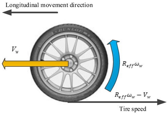 Let the longitudinal speed of the tire axis be Vw, and the linear speed of the tire in the direction of rotation be , where Reff is the effective radius of the tire, and is the angular velocity of the tire, as shown in Figure 4. The slip rate of a tire is defined as: