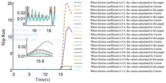 The slip ratio of the vehicle front axle is shown in Figure 8. When the road friction coefficient is 0.3–1, the slip rate calculated in this paper is basically consistent with the slip rate output by Carsim. When the road friction coefficient is 0.1 and 0.2, there is a big difference between the slip ratio calculated according to Equations (8) and (9) and the slip ratio output by Carsim. The reason is that the calculation equations of the two are different. The Carsim simulation software adopts the equation (where is the wheel speed, R is the effective radius of the tire and Vx is the wheel center speed).