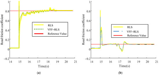 As shown in Figure 9, in Carsim, the simulation conditions in this section select two test roads with a friction coefficient of 0.8 and 0.1, respectively. The other test conditions are the same as the previous ones. It is concluded that the road friction coefficient estimator based on VFF-RLS in this paper can better track the friction coefficient value set in the Carsim software. However, the friction coefficient estimator based on the RLS algorithm will have a certain degree of overshoot and lag. Through the curve comparison, it can be found that the estimation effect of the road friction coefficient estimator based on the VFF-RLS proposed in this paper is better than the estimator based on the RLS.