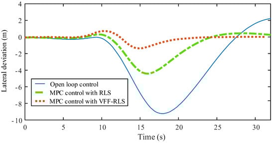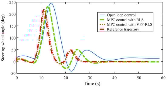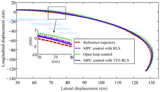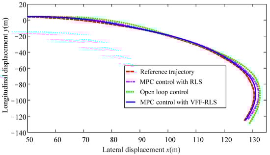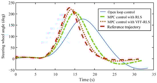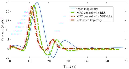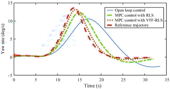 As shown in Figure 14, Figure 15, Figure 16 and Figure 17, when the vehicle is in Scenario B, whether it is the steering wheel angle, the driving trajectory or the yaw rate, it can better track the referenced trajectory. Among them, the lateral trajectory maximum deviation is (−1.0 m, 0.8 m) range. As for lateral deviation, the control result under MPC control with the VFF-RLS method is obviously smaller than that of the MPC control with the RLS method, and the deviation is controlled within a small range and is relatively stable. Thus, the outstanding trajectory tracking performance of the intelligent vehicle is achieved. In addition, large control overshoot and control time lag appear in the RLS-based MPC control system. Therefore, the MPC controller based on VFF-RLS has better control effect.