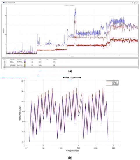 (a) Experimental Analysis Scenario before the occurrence of DDoS attacks; (b) difference in flow of network traffic once DDoS attacks is launched.