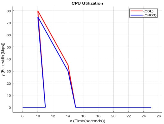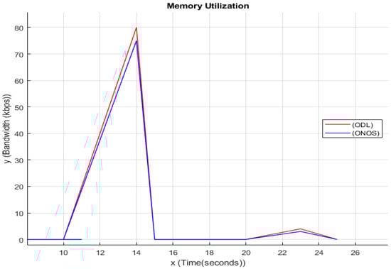 While DDoS attack is being performed on a server, all the resources of that server will be used to its maximum limit like CPU Utilization memory will also get used to the max limit; as you can see in the above graph at a particular time interval, the memory is being used to its max limit, which indicated that the memory is also being affected by the DDoS attack. In the above Figure 5, the y-axis indicates the Bandwidth in Kbps, and x-axis indicates Time which is in seconds, and the lines represent both ODL and ONOS value in the time that a certain amount of memory is being utilized. A hardware memory subsystem has multiple levels of storage-based resources and is hierarchical. Numerous sites connect those that deal with scheduling. Memory attacks can use both scheduling- and storage-based contention. An adversary can transfer data from the victim from upper-level storage-based memory resources to lower-level memory resources in the case of a storage-based dispute. In Figure 5 as a result, the victim will have to wait longer for the data to reach the processor core. An attacker can lessen the likelihood that the scheduler would choose the victim’s memory requests at a given memory level by tricking it into assigning the attacker’s requests a higher priority or by constantly attacking the scheduler with many requests at once in scheduling-based contention.
