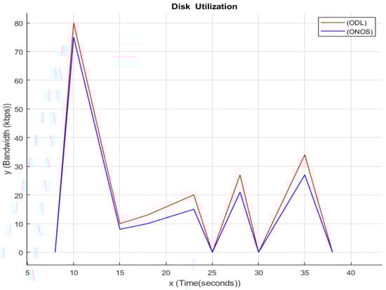 While DDoS attack is being performed on a server, all the resources of that server will be used to their maximum limit, like the CPU Utilization Disk, as shown in Figure 6, which will also get used to its maximum limit; as you can see in the above graph, at a particular time interval when the DDoS attack is being performed, the disk is being utilized, which indicated that the disk is also being affected by the DDoS attack. The y-axis in the graph above indicates the Bandwidth in Kbps, and the x-axis indicates Time, which is in seconds, and the lines represent both ODL and ONOS values in the time that a certain amount of memory is being utilized. Because of their enhanced dependability, storage capacity, fault tolerance, and other qualities, hard disc drives (HDDs) have grown to be the most popular kind of nonvolatile storage. Because of technological breakthroughs and the constant need to store massive amounts of data, modern computing systems rely largely on HDDs. The detailed scenarios and comparisons are illustrated in Table 3.