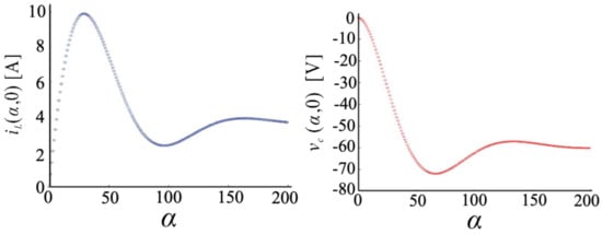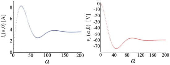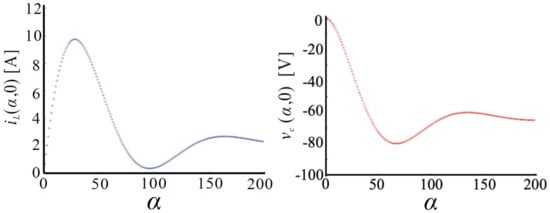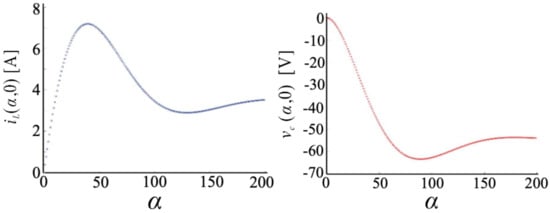 As demonstrated previously, attempting to solve (1) requires solving the group of systems of differential Equation (6). For and a constant (, the current flowing through inductor L and the output voltage across capacitor C are