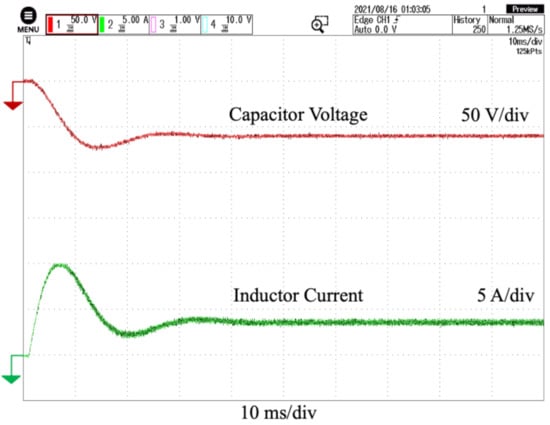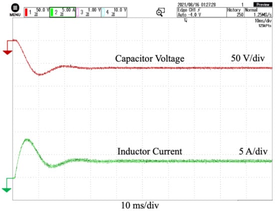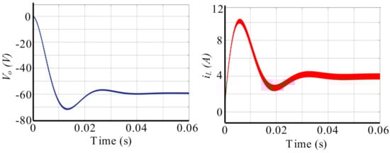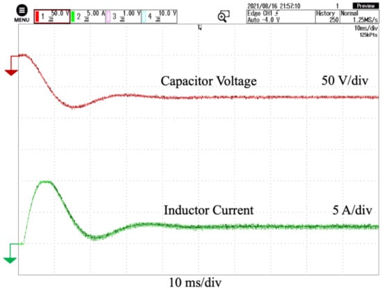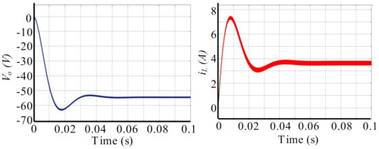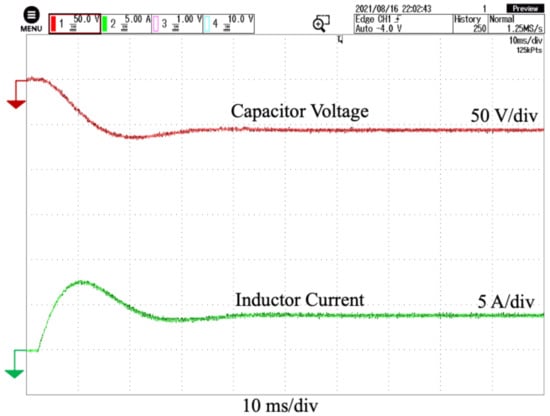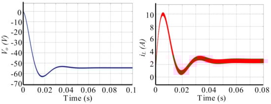 To yield the graph of the theoretical inductor current and capacitor voltage at the beginning of each switching period for each parameter set, (29) and (30) are applied for each parameter set. The theoretical initial conditions at each switching period are presented in Figure 5, Figure 6, Figure 7 and Figure 8. These initial conditions allow for the graphical expression of and over continuous time through (20)–(23). These graphs are shown in Figure 9, Figure 10, Figure 11 and Figure 12. Next, the results are obtained experimentally from HIL to compare the theoretical model presented in this paper with the experimental evidence. The experimental evidence from the HIL is shown in Figure 13, Figure 14, Figure 15 and Figure 16. As one can observe, the experimental ICCV seems to be identical to the theoretical ICCV for each parameter set. As one increases the output capacitance in the buck-boost converter, the time-duration it takes to reach steady-state increases, as shown from Figure 9, Figure 10, Figure 13 and Figure 14. Furthermore, this increase in capacitance decreases the maximum current flowing through the inductor and increases the maximum voltage across the capacitor. An increase in the inductance seems to also increase the time-duration it takes to reach steady-state increases, as shown from Figure 9, Figure 11, Figure 13 and Figure 15; the increase in has a strong effect on the steady-state ICCV, as they decreased in compared to Finally, an increase in the resistance R seems to have a similar effect to that of an increase in capacitance or inductance regarding the time-duration it takes to reach steady-state.