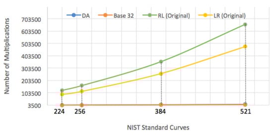 Table 3, there is a great difference in the number of multiplications and inversions between our work and the original algorithm as our work is faster by approximately 35 up to 83 times for the key sizes of 224 bits and 521 bits, respectively, when comparing with RL and 25 up to 60 times in the case of LR. Obviously, all these differences are caused by the number of inverse operations that the original algorithm requires for each point doubling or addition operation.