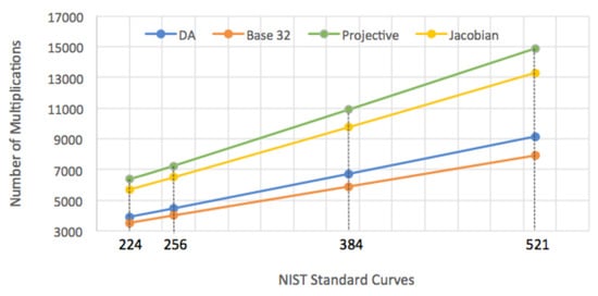 Table 6, our work represented in the base-32 multiplicands algorithm maintains its place as the optimal algorithm in terms of number of multiplications and maximum levels of parallelization. Likewise, we find that the Jacobian algorithm outperforms the projective algorithm in terms of the same factors, which led us to another comparison between base-32 multiplicands algorithm and the Jacobian coordinates algorithm to monitor if the difference in performance shrank with the size of the key or continued to increase. Despite the slope values in the straight-line equations that show the differences, we computed the delta value,
