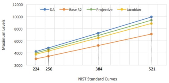 Figure 6, all algorithms are graphed as straight lines of varying slopes, which gives us the opportunity to apply a straight-line equation to any algorithm to predict the expected values, whether it is the number of multiplications or the maximum levels of parallelization at the level of a larger key size.