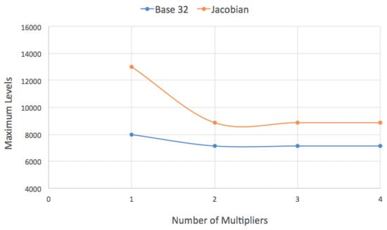 Table 9 shows another comparison between our optimal algorithm specified in the previous sections compared to the Jacobian algorithm, in terms of the maximum levels (MaxLs) at specific numbers of multipliers.