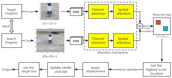 In the proposed algorithm, the network model first needs to be trained to input the target image and the search image, where the size of the target image is 127 × 127 × 3. During the search process, the objects should be searched for in an area four times larger than the original target, so the size of the search image is 255 × 255 × 3. Then, the CNN network is used to extract the features of the template image and the search image, with the feature map sizes set to 6 × 6 × 512 and 22 × 22 × 512, respectively. Finally, the response map is obtained by inputting the feature map into the CBAM module for similarity measurement. CBAM is a lightweight and efficient module that takes advantage of channel and spatial attention mechanisms without requiring additional weights or computational cost. In this module, we first weighted the input data on the channel to improve the feature expression ability between different channels, then weighted the feature map in space to highlight the importance of different positions. The similarity measure refers to a cross-correlation operation performed on the features extracted from the template image and the search image. This procedure generates a 17 × 17 response graph.