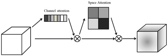 According to different principles, attention mechanisms can be divided into two types, namely, spatial attention mechanisms and channel attention mechanisms. In neural networks, different channels are equivalent to different filters. Channel attention increases the weight of the channel associated with the semantic feature expression of the target appearance, and reduces the weight of other irrelevant channels in order to provide direction and certainty for the selection of task filters or the consideration of features. Channel attention can change the correlation between different channels as well [28]. The channel under high-level semantics can be considered as the response of specific objects, generally accompanied by a certain correlation between each other, such as cats’ ears, eyes, nose, etc. Enhancing the correlation is beneficial in improving the extraction of feature appearance semantics. In contrast, spatial attention is capable of making feature extraction more efficient by increasing the weight of spatial positions related to important features which ought to be highly emphasized. In neural network training, an image has abundant pixel information; however, only certain specific areas are relevant to the main body of the task, and therefore need special attention. Spatial attention can establish the dependency relationship between two long-distance pixels in the feature map, which is conducive to strengthening the semantic expression of feature extraction. The addition of a spatial attention mechanism reinforces the recognition rate of key image information without incurring excessive calculation.