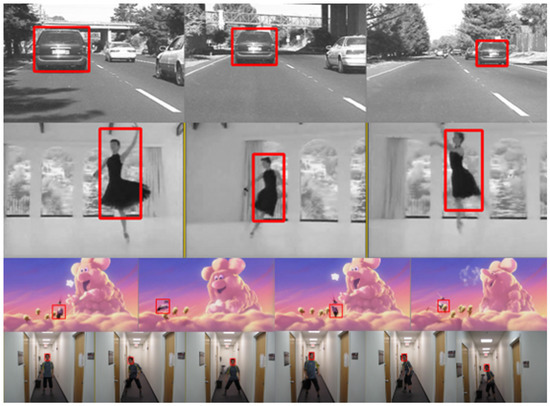 In the actual target tracking process, video clarity is often non-ideal, which poses certain challenges to trackers. Common issues include the target region being blurred due to the motion of the target or camera (MB), the ground truth motion being larger than tm pixels (tm = 20) (FM), and the number of pixels inside the ground-truth bounding box being less than tr (LR). The tracking effect of the proposed tracker in these scenarios is shown in Figure 11. The success rate and accuracy of a one-time evaluation of the tracking results are shown in Figure 12.