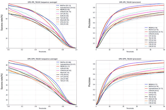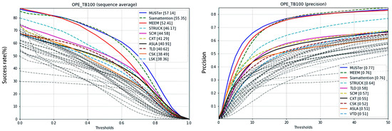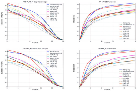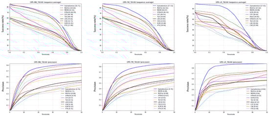 As mentioned in the previous section, the proposed tracker is in the top three in all visual conditions and has good adaptability. It has a high success rate and accuracy in the fast motion (FM), motion blur (MB), low resolution (LR), and scale variation (SV) scenarios, ranking first. The analysis is summarized in Table 4 and Table 5.