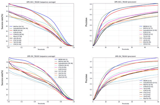In the actual target tracking process, sometimes the target in the picture is not complete, which poses certain challenges to the tracker. Common issues include the target being partially or fully occluded (OCC) or a portion of the target leaving the view (OV). The tracking effect of the proposed tracker for such scenarios is shown in Figure 9. The success rate and accuracy for a one-time evaluation of the tracking results are shown in Figure 10.