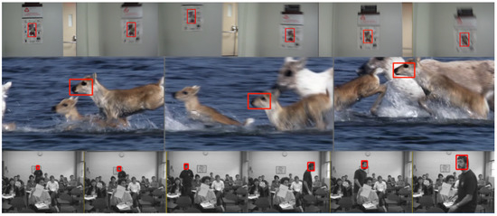 Several challenging video sequences in OTB-2015involving a fuzzy objective. From top to bottom, pictures are: BlurOwl, Deer, Freeman3. The attributes are MB, FM, and LR. In these two scenarios, the tracking recognition effect is good and there is no significant drift or tracking failure.