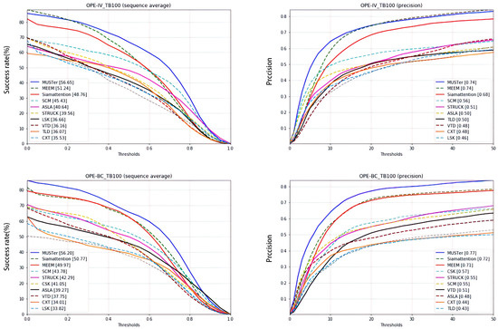 In an actual target tracking process, the target environment is often uncontrollable, which poses certain challenges to the tracker. It is common that the illumination in the target region is significantly changed (IV), or that the background near the target has a similar color or texture as the target (BC). The tracking effect of the proposed tracker in such scenarios is shown in Figure 13. The success rate and accuracy for a one-time evaluation of the tracking results are shown in Figure 14.