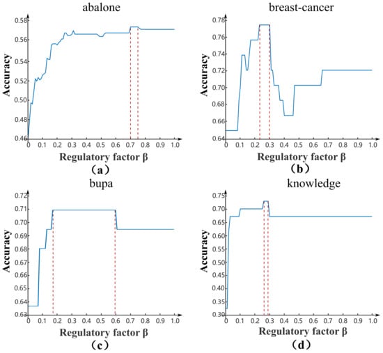 From Figure 2, for both the SLS and RQRF algorithms, the optimal interval of in each dataset was biased. On abalone, the lower bound of the interval of was greater than 0.5. On breast-cancer and knowledge, the upper bound of the interval of was less than 0.5. Only the interval of in bupa contained 0.5. Thus, it could be concluded that the regulatory factor value set as 0.5 was unreasonable for all datasets. In addition, it could be clearly seen that the interval size of regulatory factor was inconsistent. On bupa, the interval size of was the largest. On the contrary, the size was the smallest on knowledge.