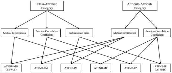 The ATFNB framework contains two categories, and each category provides several popular indexes to represent the characteristic of datasets. In order to analyze the impact of different index combinations, we selected any two indexes from two categories, respectively. Excluding the gain ratio from the class–attribute category, six weighted NB models could be constructed as shown in Figure 3. Notably, ATFNB-IP and ATFNB-MM were equal to ATFNB and CFW-, respectively.