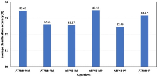 Then, we compared the six combinations on the 50 UCI datasets, and the average accuracy of the six combinations are shown in Figure 4. From Figure 4, it can be seen that ATFNB-PP had the lowest average accuracy, but the average accuracy of ATFNB-PP outperformed the basic NB and NB (0.8146), WNB (0.8028), and CFW (0.8169). This further demonstrated the effectiveness of the ATFNB framework with an adaptive regulatory factor. In addition, compared with three indexes the from class–attribute category, the average accuracy of ATFNB-M* (denoted ATFNB-MP and ATFNB-MM) was better than ATFNB-P* and ATFNB-I*. This meant that the mutual information from the class–attribute category was more signification than the Pearson correlation coefficient and information gain.