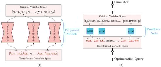 Figure 3. The proposed device representation learning scheme within a sizing problem, where the latent variables are shown in red. (a) The original variable space of the sizing problem is changed into a transformed one, by mapping sets of variables that belong to devices into continuous latent ones. (b) During the optimization, a query from the optimization algorithm is transformed back to the original variable space using the predictor networks, prior to simulation.