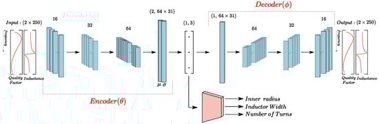 The overall architecture employed for the derivation of continuous inductor representations is shown in Figure 4. The VAE part of this model is implemented using 1D convolutional filters, and the inputs to this model are tensors of size B × 2 × 250 , where B is the batch size. Both the encoder and the decoder have 3 convolutional layers with kernel size 4, stride 2, and padding 1, while the filter size is shown in the Figure 4. The ReLU non-linearity is used. Two linear layers are used before and after the projection to the latent space, which has M = 3 dimensions. It is important to state that the convolutional architecture is preferred, in order to take advantage of the spatial correlations between the entries of the 1D vector inputs.