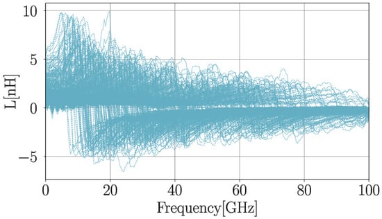 The model was trained using the Adam optimizer for 1000 epochs and a 80–20% training-test split. After training, the test data were mapped to their latent representations, by passing them through the encoder part of the VAE, and the predictor’s accuracy was calculated as 94 % for number of turns and 96 % for inductor width. For the inner radius, the MSE score is 0.11 , where the values are normalized in the [ 0 , 1 ] range. An illustration of the model’s operation is also shown in Figure 5, where 500 descaled random samples from the model are depicted. This is completed by sampling from the isotropic, unit variance, zero mean Gaussian distribution p ( z ) and passing the samples from the decoder network. It is seen that the curves follow a particular trajectory, which resembles the resonant characteristic of the actual inductor’s curves.
