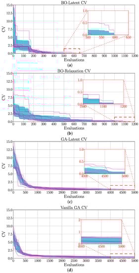 Here, it is seen that the BO that works in the transformed space requires roughly 600 evaluations to find feasible solutions. In the case of the BO with the relaxation procedure, all executions find feasible solutions at around 1100 evaluations. The mixed-variable GA’s CV seems to stagnate at 4000 evaluations, whereas the transformed space formulation of GA seems to improve its CV even at the end of the experiment.