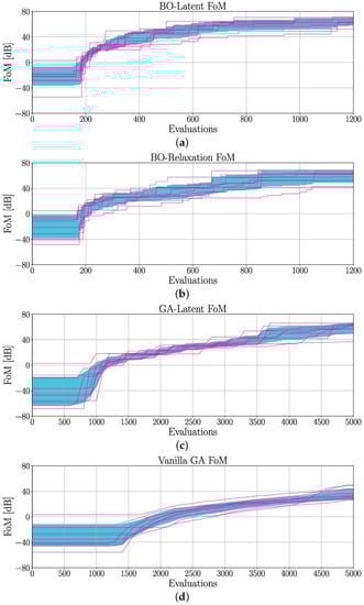 Figure 9. The evolution of the LNA’s FoM during the automatic sizing, using the four discussed formulations. The blue area indicates the confidence region of ±std, while the purple lines are the curves of each repetition. (a) BO-Latent. (b) BO-relaxation. (c) GA-latent. (d) GA.