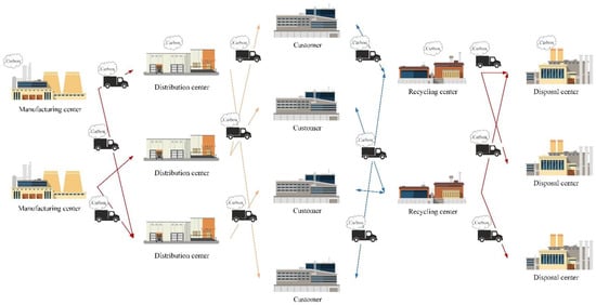 This article examines a generic multi-echelon SSCN, which handles the forward flow of new products and the reverse flow of end-of-life (EOL) products. The structure of the generic SSCN structure is illustrated in Figure 1. The proposed network structure can be modeled in various industries, including the pharmaceutical industry [36], the steel-based products industry [37] and the tanker industry [17]. In Figure 1, the new products are produced by manufacturing centers and transited to distribution centers and then to the customer markets to satisfy their demands. Furthermore, when the products reach the end of life, the EOL products are collected in recycling centers where they are tested, inspected, sorted and classified into two different parts: unrecyclable EOL products and recyclable EOL products. The recyclable EOL products are reprocessed and assembled in recycling centers and returned to the customer market. On the other hand, unrecyclable EOL products are transited to disposal centers to be disposed of and scrapped by decomposition and/or incineration.