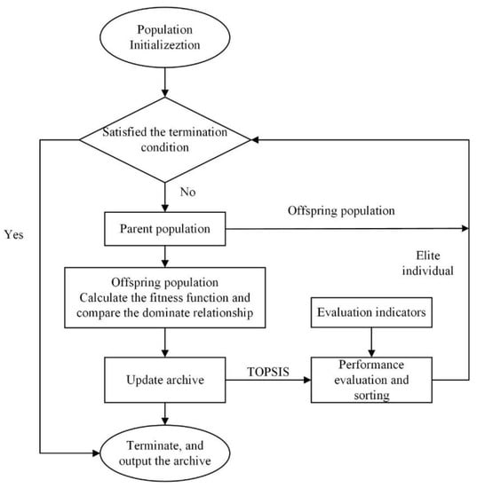 Validi et al. used three independent optimization algorithms based on genetic algorithms (NSGA-2, MOGA-2 and HYBRID) to solve their green multi-objective model [33]. They paid attention to economic performance by minimizing cost and ecological performance by minimizing carbon emissions. Then, using a multi-attribute decision-making approach, TOPSIS, the solution is adopted to sort obtained alternative transportation routes. Mandal et al. adopted TOPSIS to evaluate feasible Pareto solutions calculated by MOPSO and select the optimal one with the best efficiency value in optimizing Cu-MWCNT composite electrode machining [15]. The solution decision-making approach in the abovementioned literature can be summarized as a two-stage technical approach. In the first stage, heuristic methods are used to obtain the feasible decision scheme set (i.e., the final Pareto optimal solution set). In the second stage, various multi-criteria decision-making approaches are adopted to evaluate and sort these Pareto optimal schemes so as to obtain the optimal scheme. Furthermore, some studies focus on performing supplier measurement in the first stage and solution decisions in the second stage. Lahri et al. integrated supplier selection and SSCN design [34]. BMW and TOPSIS are utilized to measure the sustainability performance of suppliers so as to obtain the green image weight, which is used to design network design. The ε-constraint method is adopted to solve their multi-objective possibility mixed-integer programming model. Moheb-Alizadeh et al. utilized the bi-objective DEA method to measure the efficiency of supply chain nodes and considered them as the optimization objectives [35]. Then, the proposed multi-objective stochastic programming model was solved by the Lagrangian relaxation algorithm and multi-choice goal programming. It can be seen that two-stage methods in most studies are independent of each other; in other words, model solution and measurement are independent. Hence, a parallel approach, integrating optimization and measurement, is proposed in this research. In each iteration, the feasible solutions in each archive are sorted according to their sustainability performance, and then, the sorted individuals guided the next iteration. In this article, the entropy-weighted TOPSIS method and meta-heuristic algorithms are integrated with the proposed performance-oriented optimization framework.