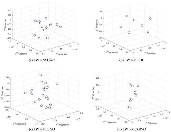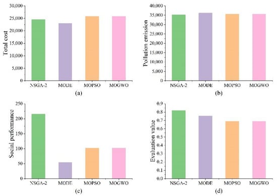 By comparing the performance evaluation value of the Pareto optimal solutions, all the feasible solutions are sorted, and the solution with the best performance evaluation value is considered as the optimal solution, which is bolded in each table. From Table 4, Table 5, Table 6 and Table 7 and Figure 6d the performance evaluation value of the optimal solution is 0.8865 in EWT-NSGA-2, 0.7535 in EWT-MODE, 0.8191 in EWT-MOPSO and 0.6896 in EWT-MOGWO. Hence, the solution calculated by EWT-MOPSO and EWT-NSGA-2 has better sustainability performance than the other two meta-heuristic algorithms based on EW-TOPSIS.