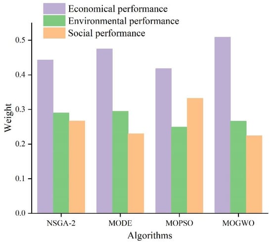 This section performs a sensitivity analysis of different strategies for the performance of the performance-oriented optimization framework. The meta-heuristic algorithms with entropy-weighted TOPSIS, with TOPSIS, and without any evaluation strategy are utilized to calculate the numerical case. Then, we compare the performance evaluation value of the obtained Pareto optimal solution set. In the case of the meta-heuristic algorithms without an evaluation strategy, the final Pareto optimal solutions are evaluated by entropy-weighted TOPSIS so as to measure the sustainability performance.