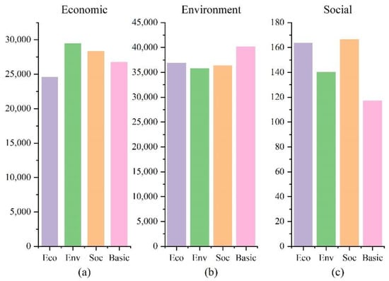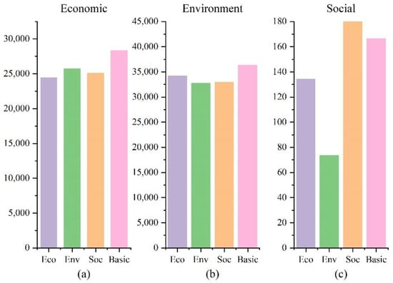 The results of three single sustainability dimensions obtained by EWT-NSGA-2 and EWT-MOPSO are demonstrated in Figure 8 and Figure 9 respectively. The optimal solution with the greatest performance evaluation value is utilized to calculate objective functions. In the two figures, “Eco” indicates that only economic indicators are selected, “Env” represents only environmental indicators, “Soc” states only social indicators and “Basic” represents that all sustainability indicators are used. Part (a) presents the economical objective function, part (b) states the environmental objective function and part (c) shows the social objective function.