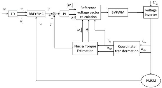 The chapters of this paper are introduced as follows: In Section 2, the mathematical model of PMSM and the direct torque control system are derived. In Section 3, the principle and design of the velocity controller, the speedest tracking differentiator, and the RBF neural network based on the new reaching law are introduced in detail, and the stability proof is given. In Section 4, the new control method is verified by simulation under two conditions: constant load and load disturbance. The Section 5 is the conclusion of this paper.