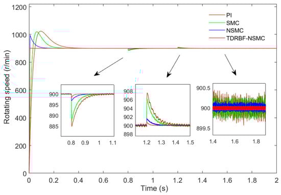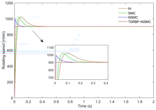 - The simulation running time is 2 s, the initial motor speed is 900 r/min, and the PMSM is started with a constant load of 10 N∙m. In order to better compare with traditional control, the PI, SMC (based on the traditional exponential approach to law), NSMC, and NSMC methods based on the TD and RBF neural network are used in this paper. The motor speed curve with three control methods is shown in Figure 5.