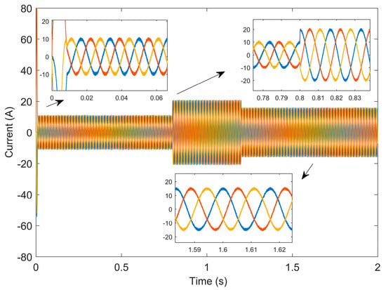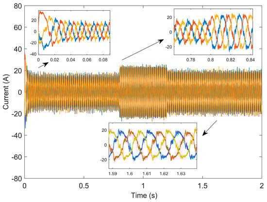 Figure 8 and Figure 9 are the waveforms of current changes based on PI control and the TDRBF-NSMC control, respectively. By comparison, it can be seen that the current curve of the TDRBF-NSMC control algorithm is smoother than that of PI control, so the harmonic content of the control algorithm is lower than that of PI control, the operation result is ideal, and the loss of the motor is smaller.