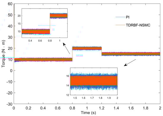 Figure 10 shows the torque response curves of PI control and TDRBF-NSMC control. It is found from the enlarged diagram that the torque ripple of TDRBF-NSMC control is smaller than that of PI control, which reduces the torque ripple by 33%. The control system operates more safely and stably. As a result, the control accuracy and tracking ability of the motor control system are greatly enhanced, and the results are satisfactory.