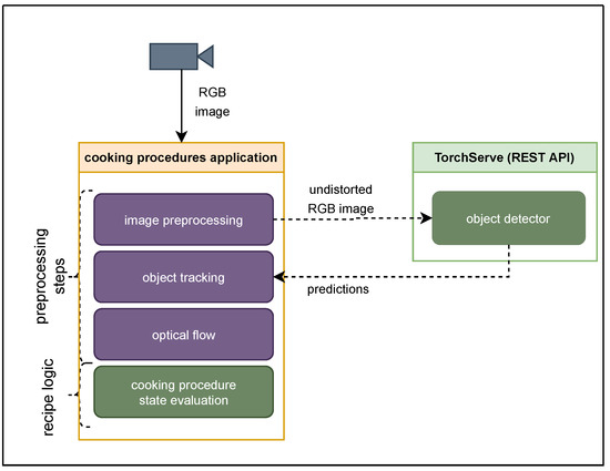The cooking procedures application iteratively runs the subsequent steps. At first, an RGB image is fetched from the camera and then lens distortion correction is applied. Afterward, the image is given as input to the object detector component, and the result contains the bounding boxes and labels of the detected objects, if any. The detections are passed through object tracking, which compensates for possible transient misses. The adjusted bounding boxes are considered as moving or not by applying an optical flow algorithm. Finally, boxes, labels and flow information of them are given as input to the recipe decision logic component for the evaluation of the current state of the recipe.