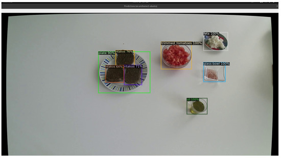 In our work, we considered cases 2 and 3. In the following sections, the entire process of detecting objects used in a cooking procedure will be explained in detail. In either case, we consider that starting from a pre-trained detection model is of great benefit. Such an approach is usually adopted because it accelerates training time, provides a good starting point for the weights of the neural network and helps to avoid over-fitting, especially if training involves few images and classes, as in our case. For case 3, we also specify the procedure and tools related to the creation of a new dataset. An example output of the detector trained on our custom dataset is shown in Figure 2.