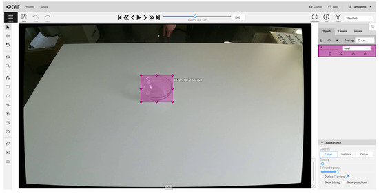 A custom dataset is a dataset that is created by the user, meaning that the user annotates the objects that the model will be trained to. As also explained in Section 3.1, the annotations consist of the bounding boxes that include the concerning object and the label of the object. The tool used for labeling out images to train the model is CVAT [32]. CVAT is a free, online, interactive video and image annotation tool for CV. Figure 3 depicts an example of the annotation workspace screen of CVAT.