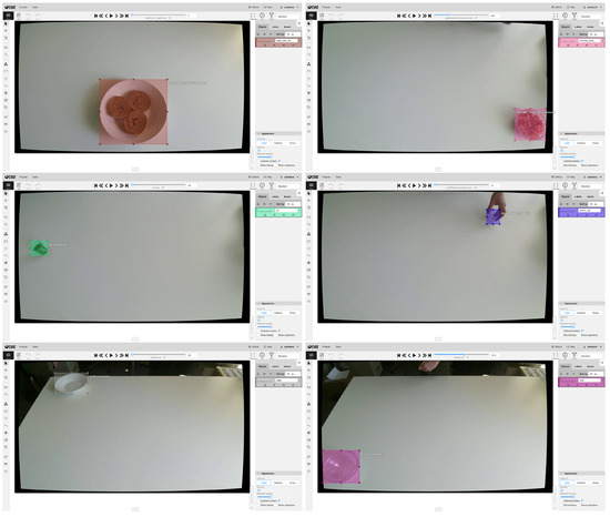 The dataset was created as follows. For each object, a separate video was recorded. The resolution of the video was 1920 × 1080, the highest of the Kinect v2 sensor. During recording, a person was instructed to place the object at various positions on the table, such that a range of positions, poses and lighting variations was captured. This is crucial for the object detector to be able to learn object characteristics that are invariant to these changes in appearance. Each video was imported into CVAT and annotations were created from sparse frames of the video, which corresponded to the different placements of the object. An example of the annotation process for some of the objects of “Greek Ntakos” recipe is presented in Figure 4. The number of annotations per object are shown in Table 4.