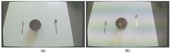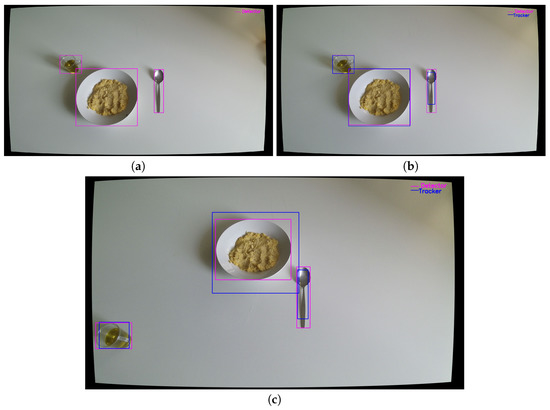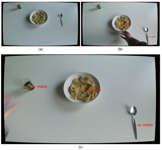 Figure 14 depicts the relative position of each object to each other. The system generates each position accordingly in real time (see Section 3.4.2). For example, in Figure 14a the plate with fava is right from the oil and left from the spoon. Similarly, the spoon is right from the oil and the plate with fava. The cup with the oil is left from spoon and left from fava. In addition to this, the configuration file, explained in Section 3.4.1, contains the required positions of the ingredients/utensils used in the specific cooking procedure. By comparing the calculated relative position to that of the configuration file, the system determines if these match each other. The results are shown in Figure 15.