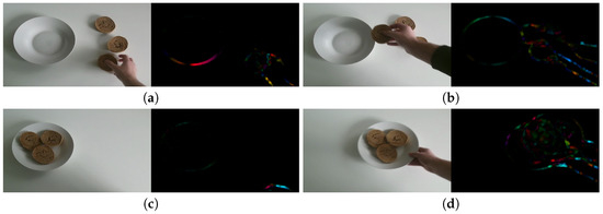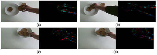 Initially, we present some more complete systems, meaning that they capture the user and/or utensils and ingredients for predicting or assisting the meal preparation. Ref. [4] approaches food preparation activities with the use of ML algorithms combined with visual and accelerometer data. The goal of multi-modal activity recognition is achieved through an accelerometer localization algorithm that facilitates the merge of accelerometer and visual data. A statistical activity model is also introduced in order to guide the construction of datasets for complex activities and give an outlook on the next steps.